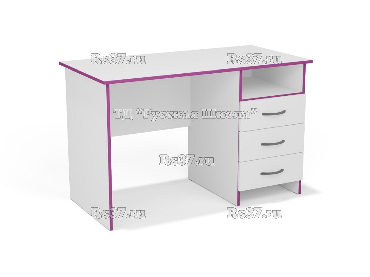 Выполнен из ЛДСП 16 мм. Торцы столешницы обработаны противоударной скругленной кромкой ПВХ толщиной 2 мм, остальные детали 0,4 мм. Верхняя часть тумбы имеет нишу, в нижней части 3 ящика на роликовых направляющих. Для защиты напольного покрытия на боковые опоры стола установлены пластиковые подпятники 2х16 мм.