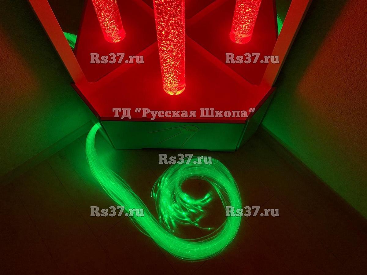 Угловая конструкция состоит из жёсткого основания, внутрь которого спрятан компрессор, подающий сжатый воздух, и открытой части с высоким воздушно-пузырьковым цилиндром и фонтаном из фибероптического волокна. Основание выполнено из экологичного МДФ и покрыто плёнкой ПВХ, устойчивой к повышенной влажности и ультрафиолетовым лучам. Такое покрытие не боится сколов, царапин, не выгорает на солнце и абсолютно безопасно для детей.
